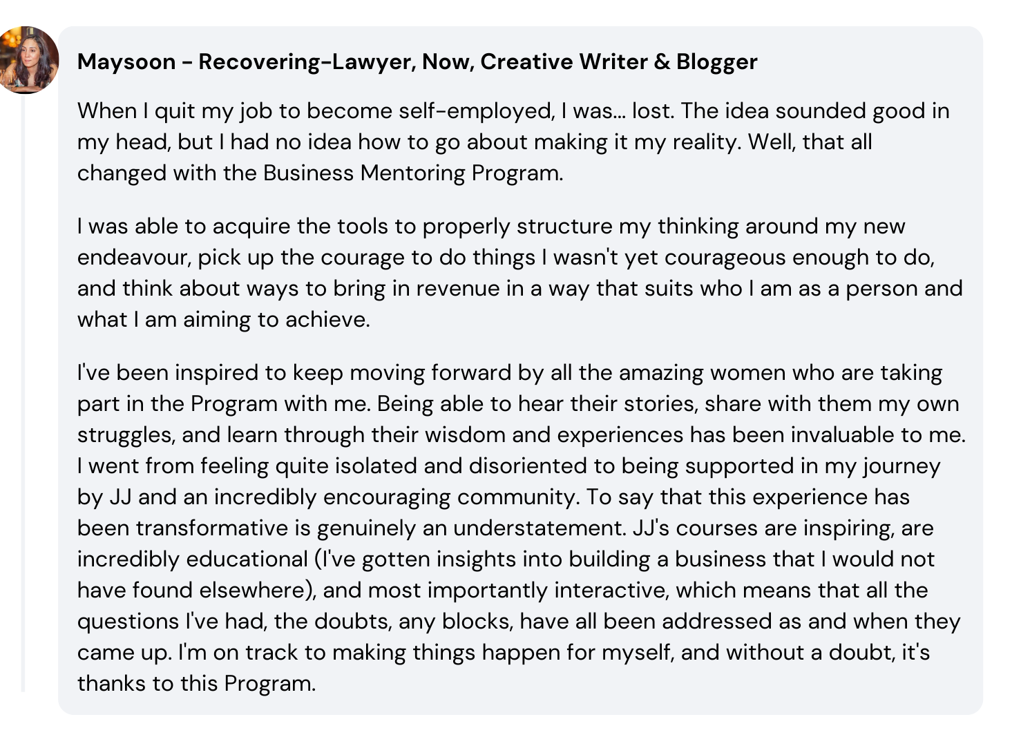 You could receive step-by-step support to help you get your business idea off the ground or improve your current business and wellbeing, and finally get control of your time and your health, have more freedom… and take holidays without permission!