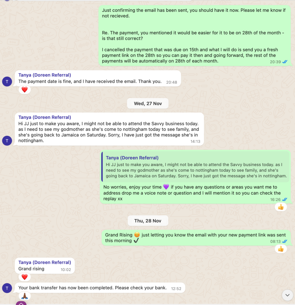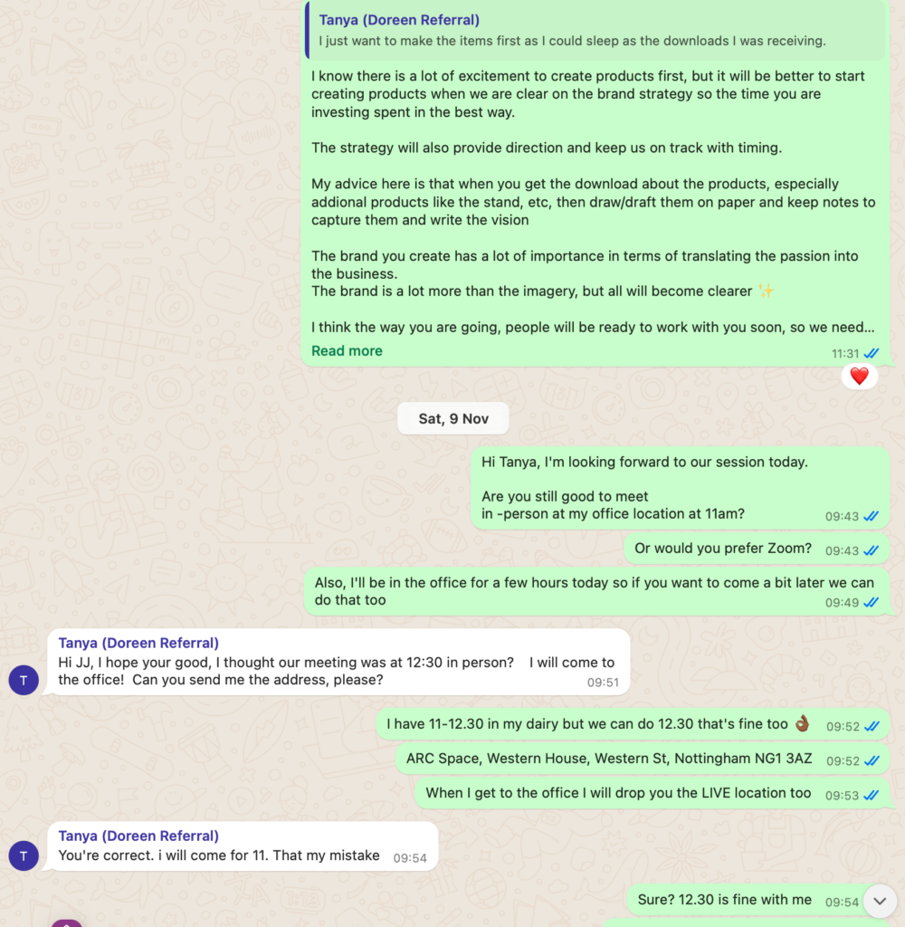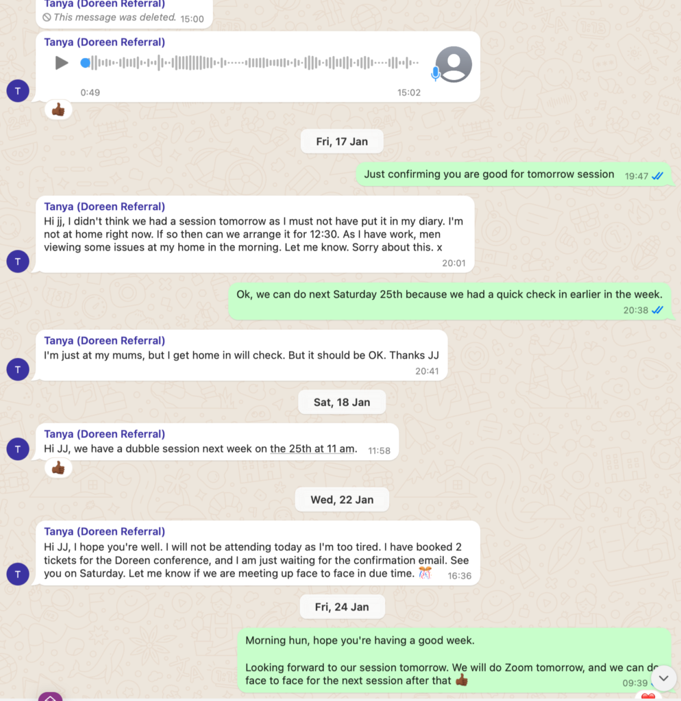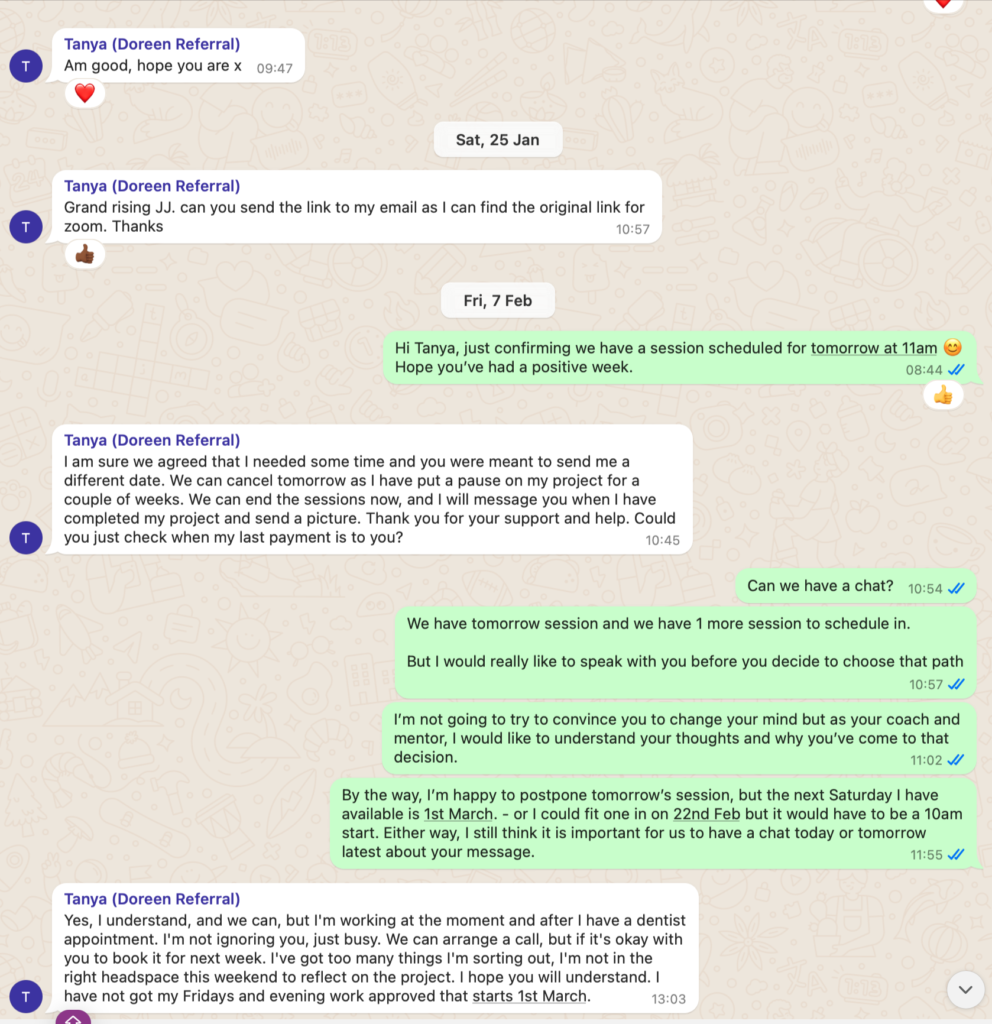 ***Services Period: First 1:1 session scheduled for 23rd October 2024 final session scheduled for 8th February but due to Tanya cancelling sessions and changing dates, at time of dispute, we still had 2 sessions left before the program is ‘officially’ completed***