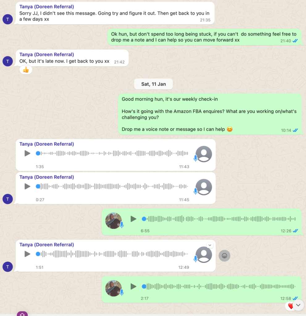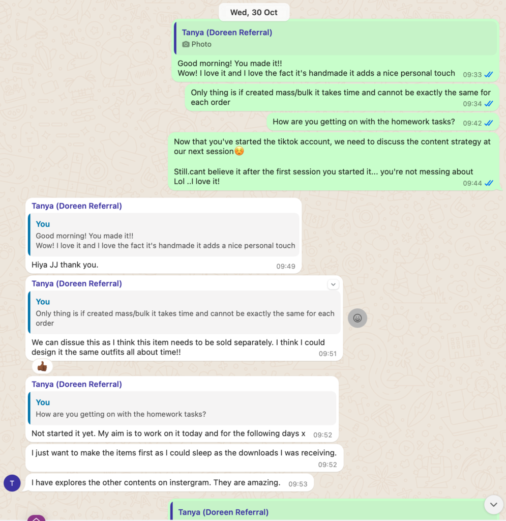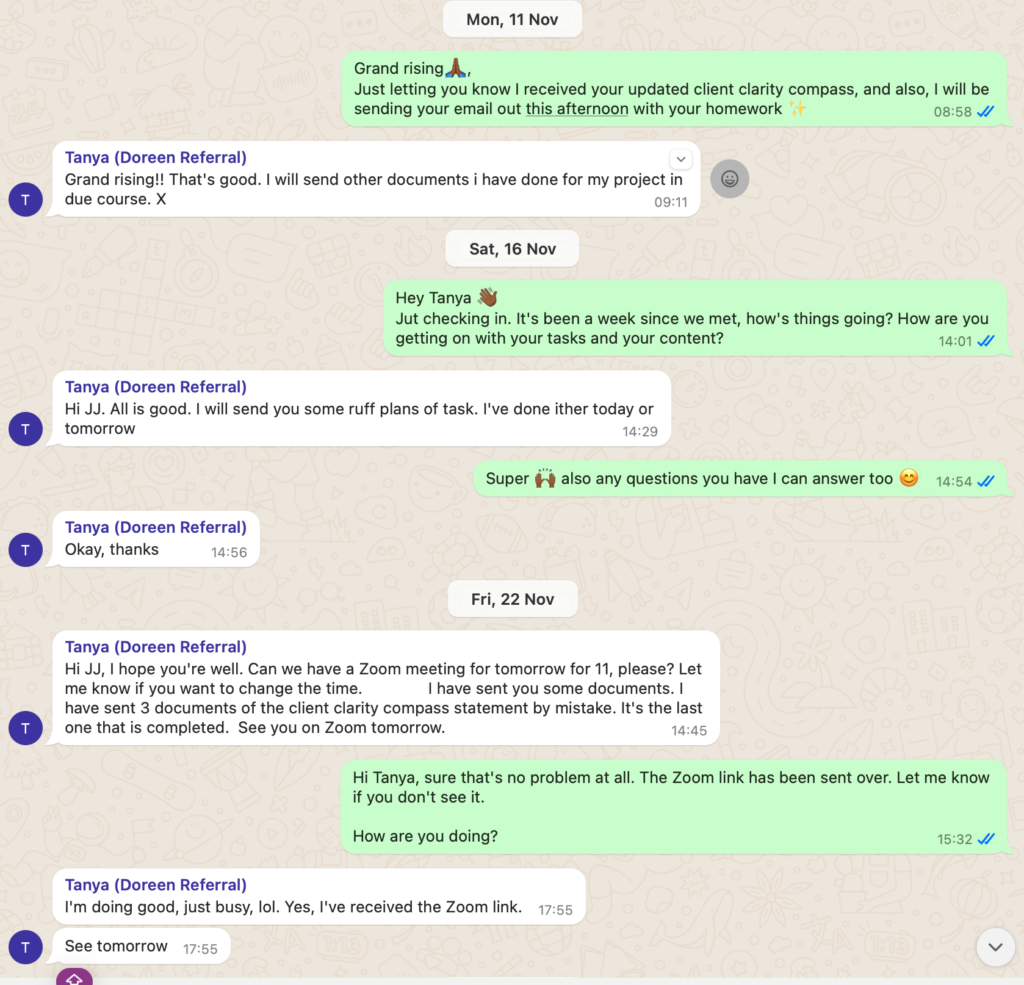 Each session was recorded, and timestamps are included to highlight key moments where Tanya confirmed participation and progress including where she failed to complete homework tasks, and where I provided the service with additional value.