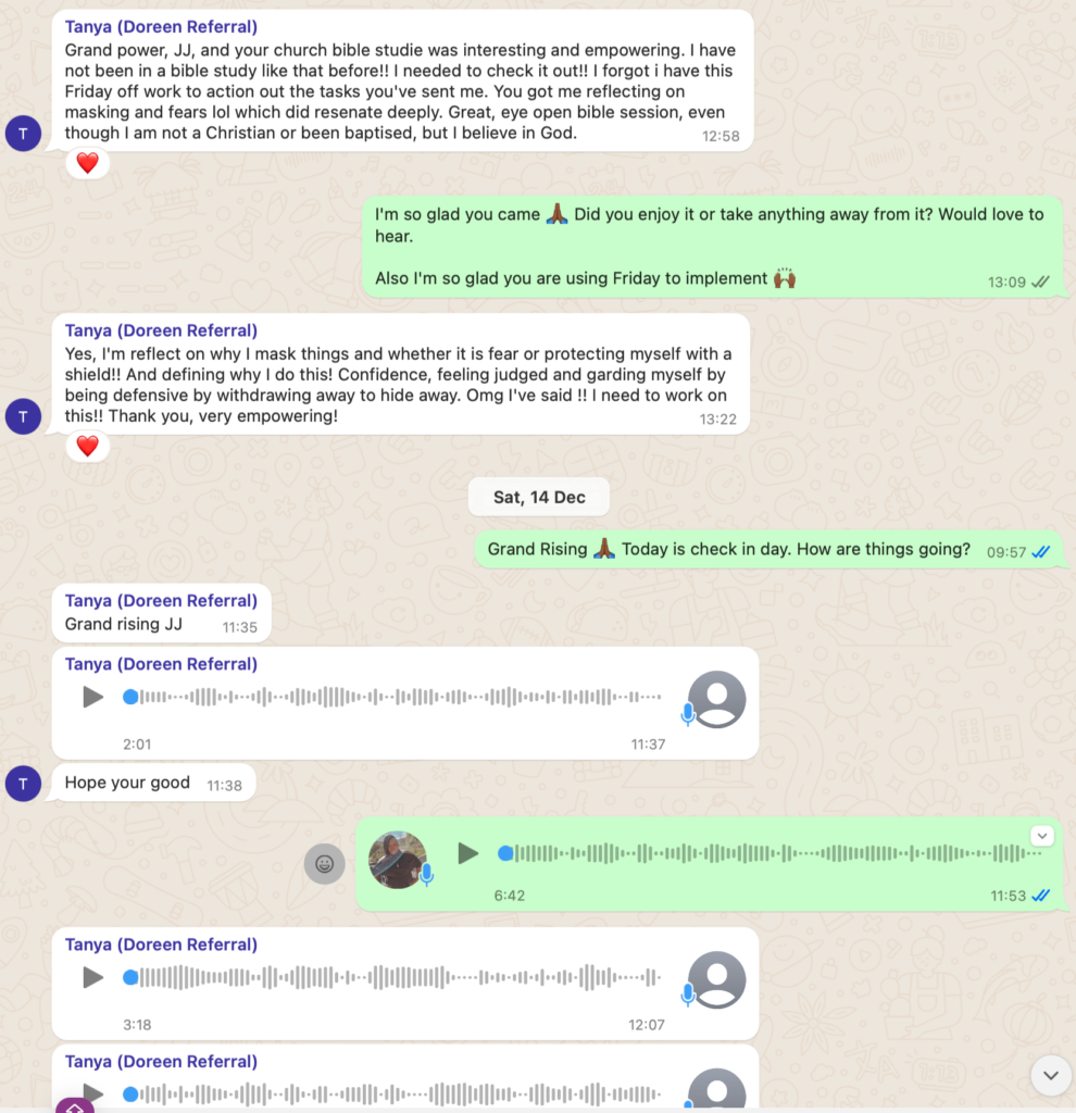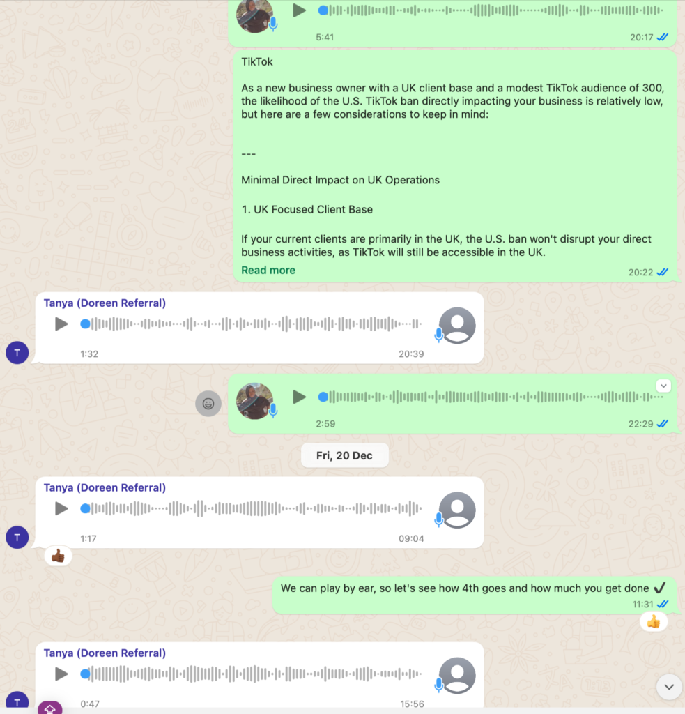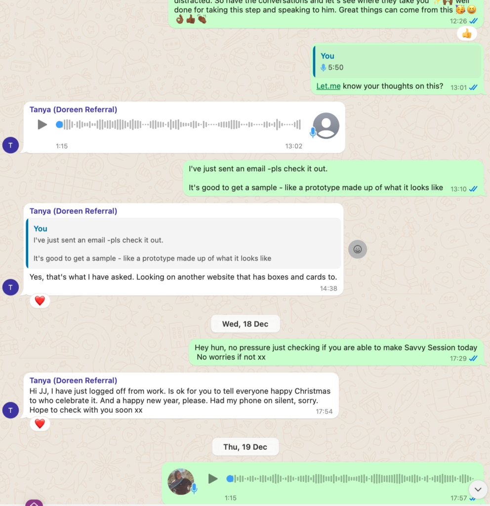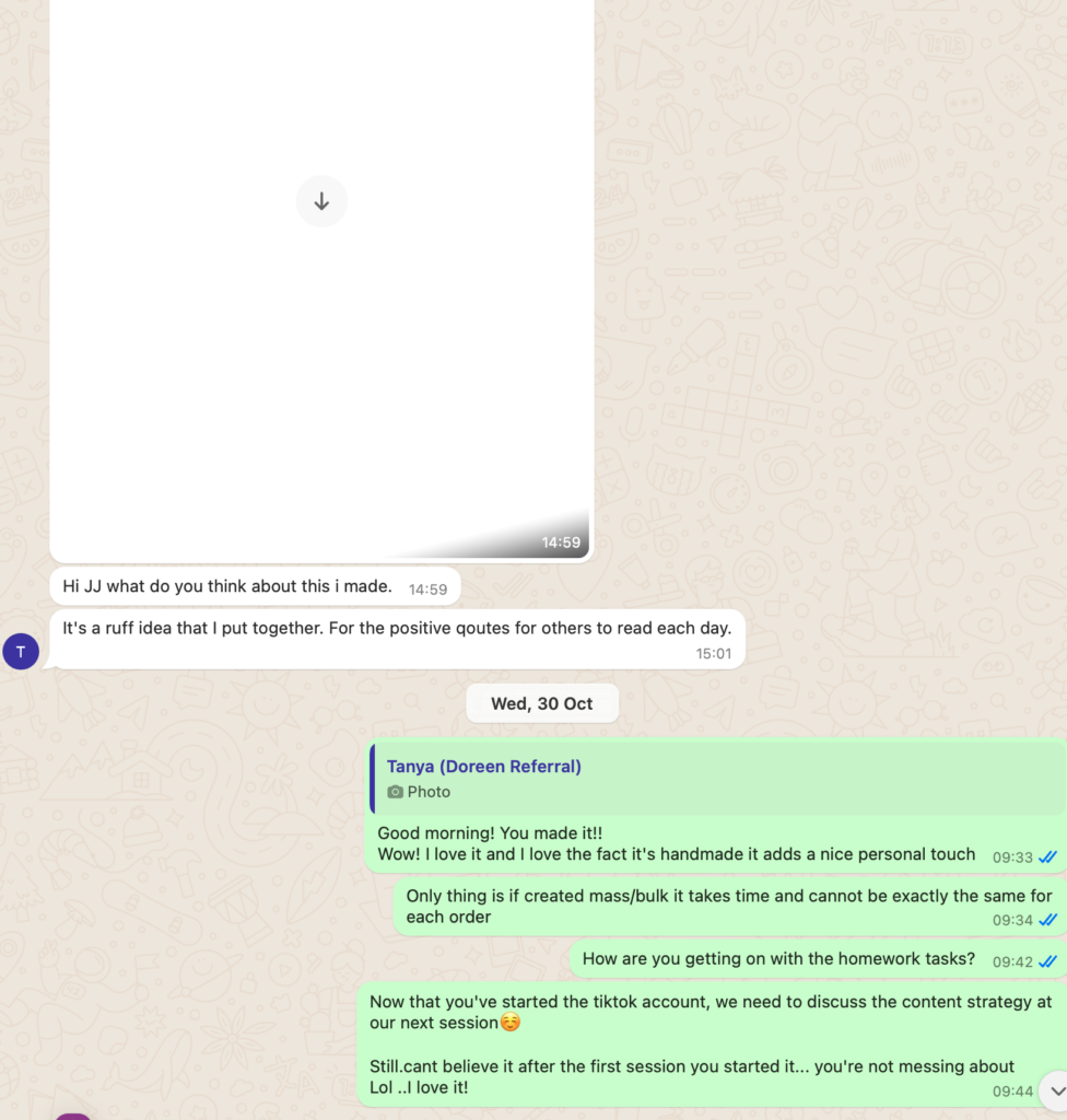 Each session was recorded, and timestamps are included to highlight key moments where Tanya confirmed participation and progress including where she failed to complete homework tasks, and where I provided the service with additional value.